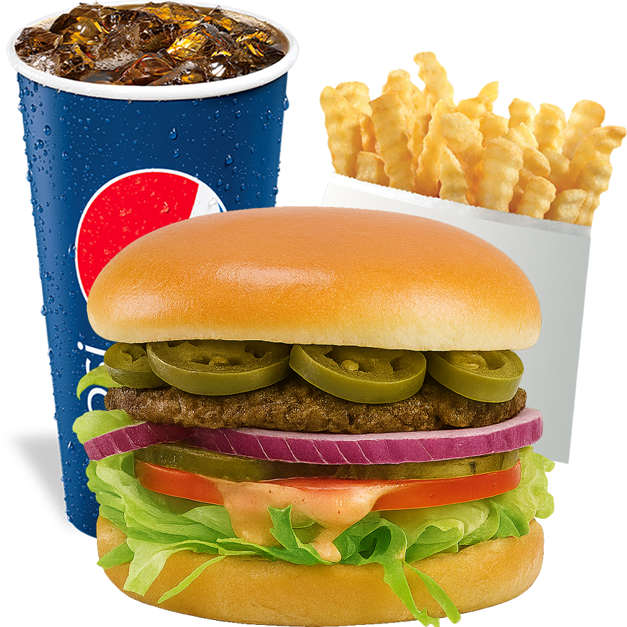 Turn up the heat 🔥 with zesty jalapeños 🌶️ layered over a juicy burger 🍔. Balanced with crisp veggies and house sauce on a toasted bun, it’s spice done right. 🍟 Comes with fries and a cold drink 🥤.